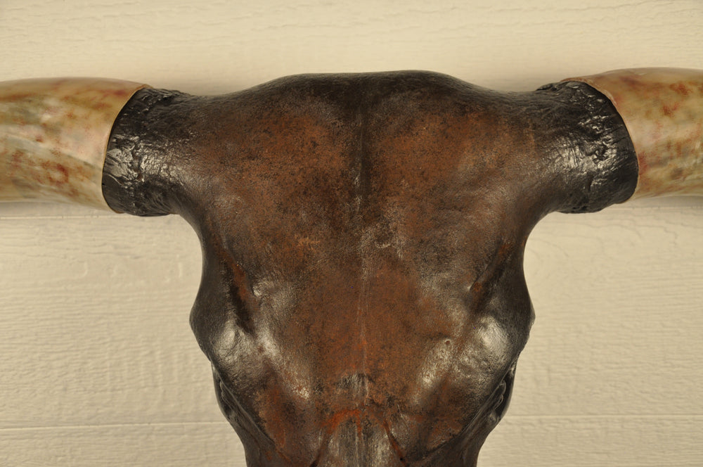 Big bulls don't come around often enough. Bull skulls are usually heavy and really large. Diablo is no exception. The large skull is finished in darkened iron that is rusted and polished to silver-gray highlights. The downward sweeping horns are a tapestry of color, dominated by a deep black which is rare in bulls. The piece includes a custom angled skull hanging bracket. Add a hand-made backdrop to your artwork, or contact us to discuss your own custom backdrop ideas. This powerful longhorn will make a strong statement in any home, ranch, office or man cave.
